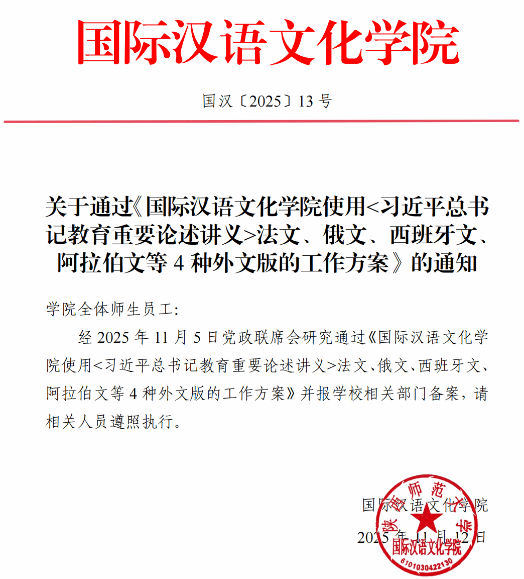 为深入学习《习近平总书记教育重要论述讲义》的精神,推动《习近平总书记教育重要论述讲义》法文、俄文、西班牙文、阿拉伯文等4中外文版用于十三水留学生教育工作,帮助来华留学生了解新时代中国教育改革发展成就,根据教育部办公厅《关于推动<习近平总书记教育重要论述讲义>法文、俄文、西班牙文、阿拉伯文等4种外文版使用的通知》的精神,按照学校的批示要求,结合十三水留学生中国国情教育等实际情况,特制定本办法。