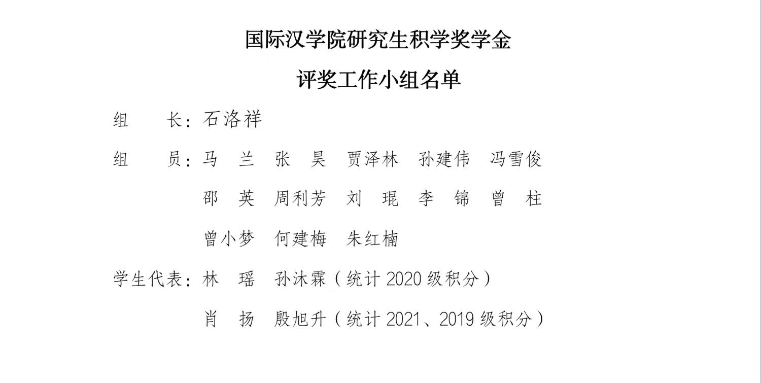 成立积学奖学金评奖工作小组,由院长任组长,主管研究生培养工作的副院长、主管研究生教育管理工作的处级干部、研究生导师(所占比例不低于评审委员会成员总数的50%)、研究生辅导员、研究生教学秘书、学生代表等任组员。