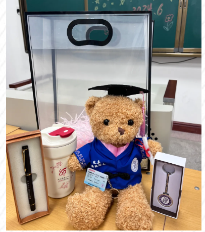 向毕业生赠礼。印有每个同学姓名的专属布偶和专属钥匙扣、印有十三水